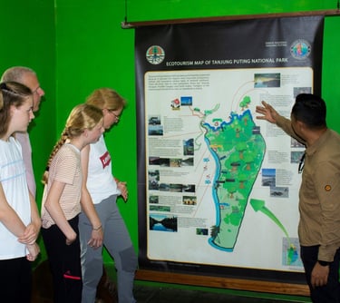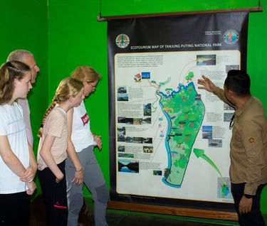 Your orangutan tour begins with a scenic two-hour cruise up the Sekonyer River, heading towards Tanjung Puting National Park. Your first stop is Tanjung Harapan Camp, where you will trek approximately 1 km through the lush rainforest to witness the 3 PM orangutan feeding. Take your time to enjoy and photograph this unique experience as your guide shares fascinating insights about the ancient Borneo rainforest.