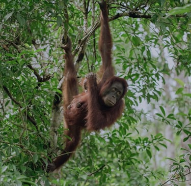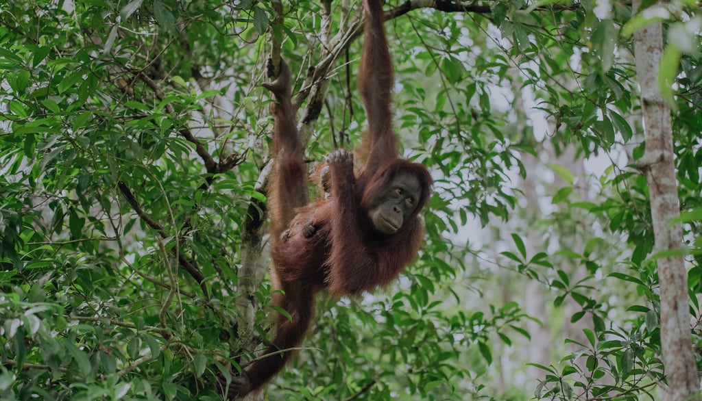 Maternal Bond: Young orangutans cling to their mother's body as she moves through the forest canopy during the first few years of their lives.