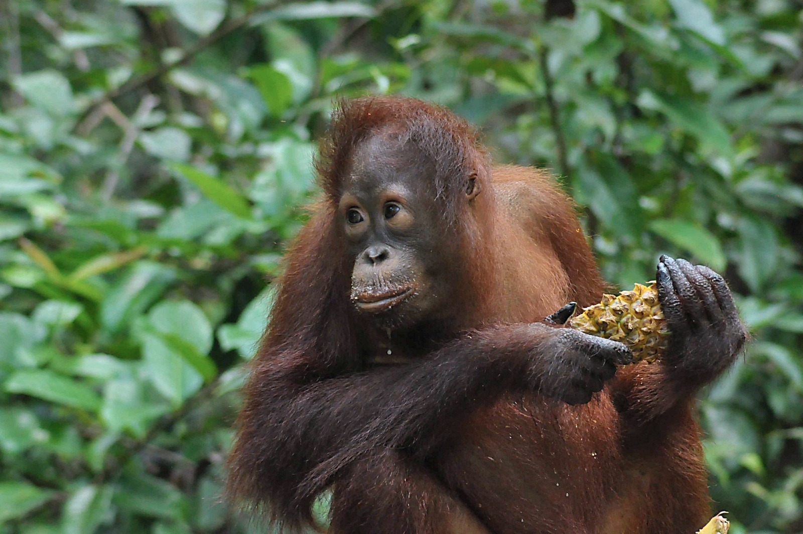 Orangutans have been observed using tools for various purposes, including scratching, sheltering from rain and sun with leafy branches, and fishing for inaccessible branches or fruits. They also use tools for insect foraging, honey collection, and protection against stinging insects. In Sumatra, wild orangutans use tools to extract seeds from hard-shelled fruits. Notably, orangutans in captivity have even been taught to use stone handaxes.